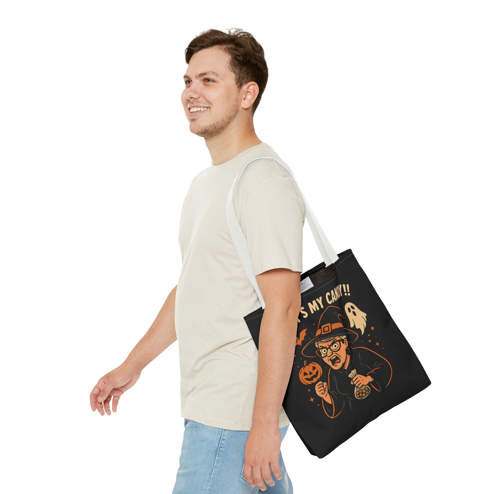 This playful tote bag is perfect for the Halloween season! The whimsical design features a comical witch exclaiming "That's my candy!!" against a backdrop of ghosts and pumpkins, adding a spirited touch to your autumn wardrobe. Made from durable 100% polyester, it's not just stylish but built to withstand everyday use, making it ideal for grocery runs, Halloween parties, or trick-or-treating with the kids. This tote bag is perfect for anyone who loves the fun of Halloween and wants to carry a piece of that joy everywhere they go. It makes a great gift for friends and family who enjoy celebrating spooky festivities, ideal for Halloween lovers, students, and anyone in need of a reliable bag for fall outings.